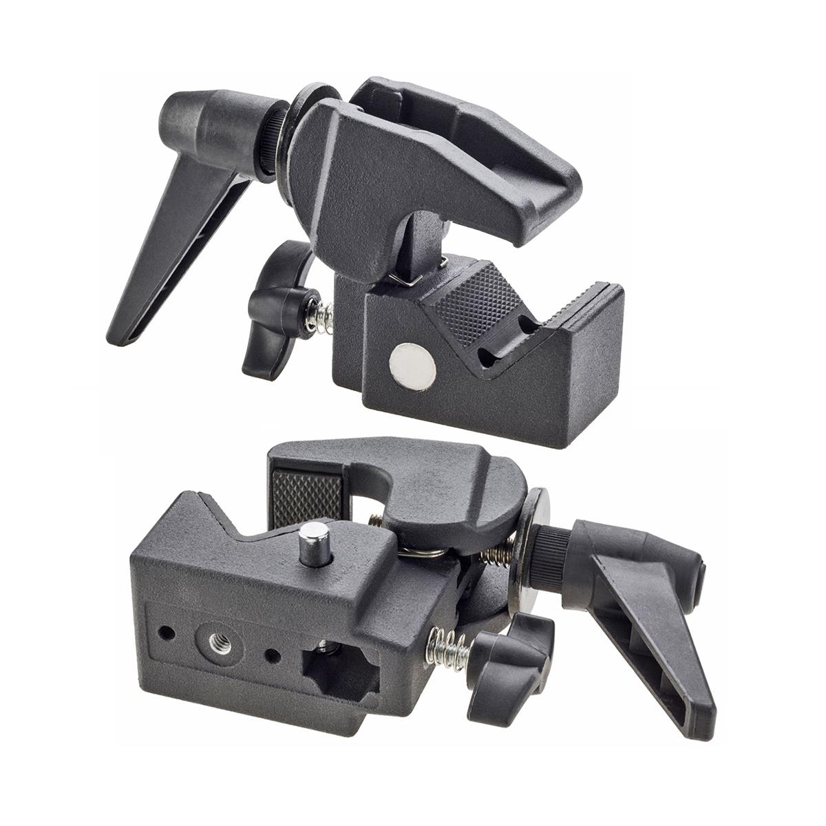 Gracias a sus 2 accesorios de agarre incluidos, puede sujetarse a casi cualquier superficie en el estudio, como tubos de hasta 2 pulgadas, superficies planas, etc. Incluye una superficie adicional para morder tubos de pedestales.
