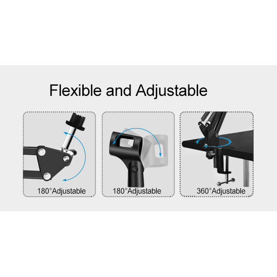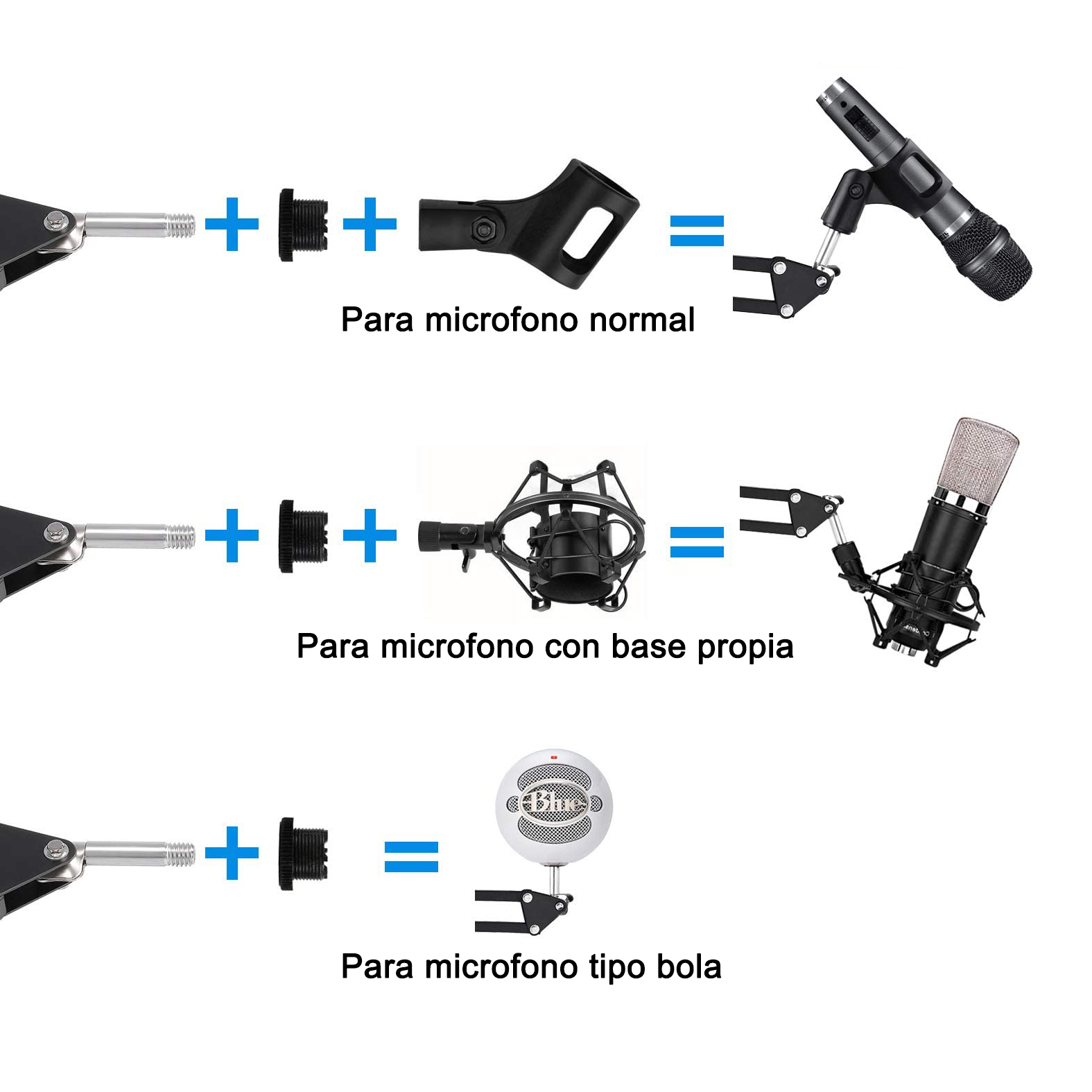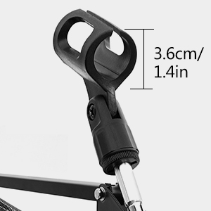 Su cabeza incorpora un acople estándar de 3/8” para utilizarlo con micrófonos con su propia base, una base plástica de 3.6 cm de diámetro para micrófonos de mano, y un suple adicional plástico de 1/2″, para aun mas tipos de micrófono.