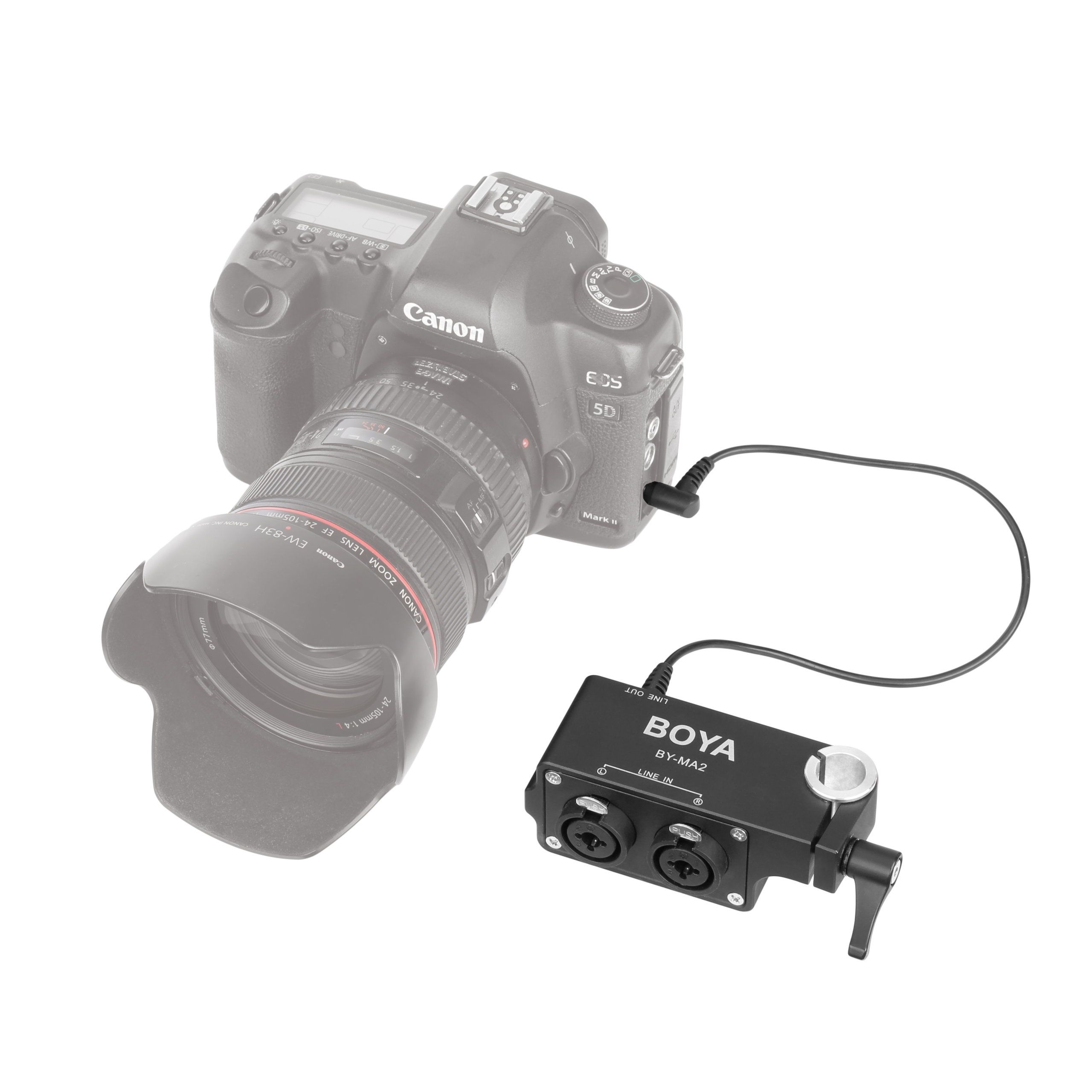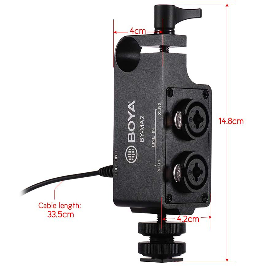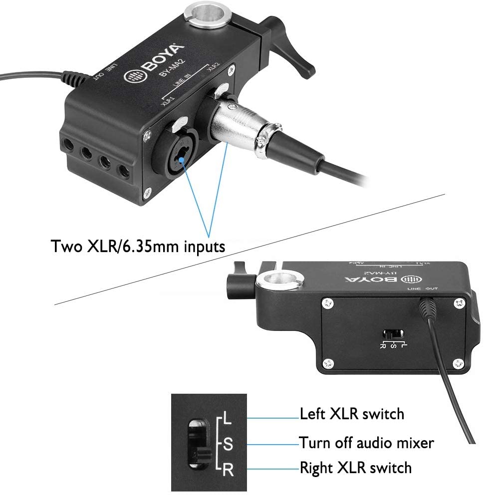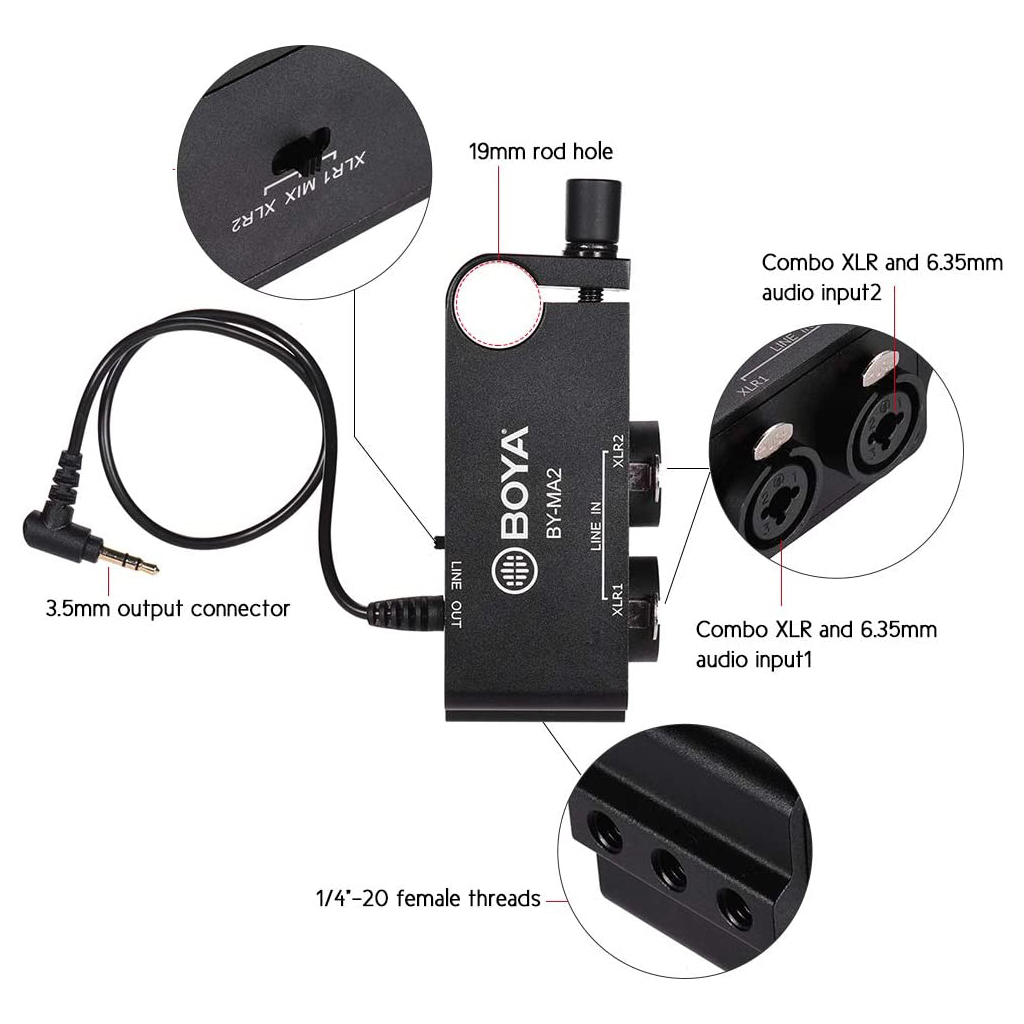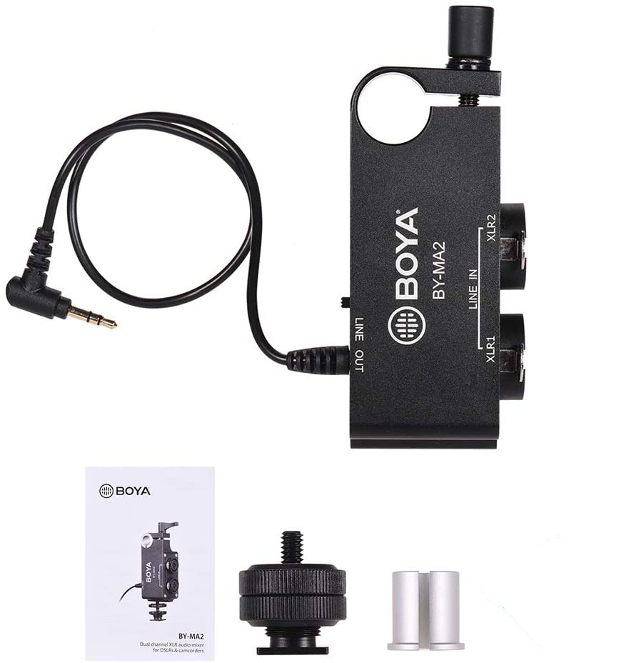 Mezcladora de audio de dos canales, Boya BY-MA2, con dos entradas XLR, y salida TRS de 3.5mm, para filmadoras, cámaras DSLR, y otros dispositivos compatibles.