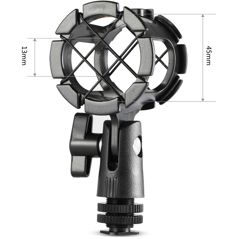 Acomoda micrófonos desde 15mm a 40mm de diámetro, e incluye una perilla para ajustar el ángulo del micrófono.