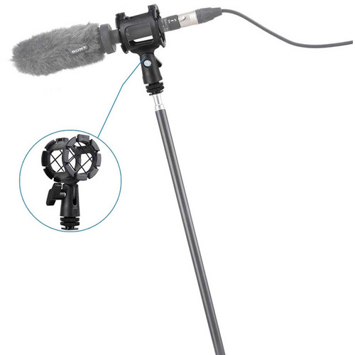 Gracias al sistema de suspensión de 4 puntos, soporta micrófonos tipo Shotgun o Cañón, y otros micrófonos cilíndricos. Incluye un acople de zapata para montarlo sobre cámaras, o un acople de 3/8” para acoplarlo a un Boom o empuñadura de mano.