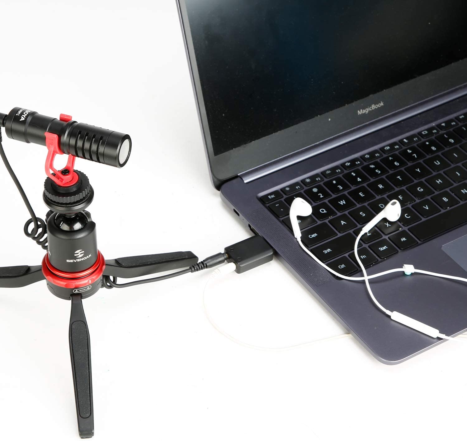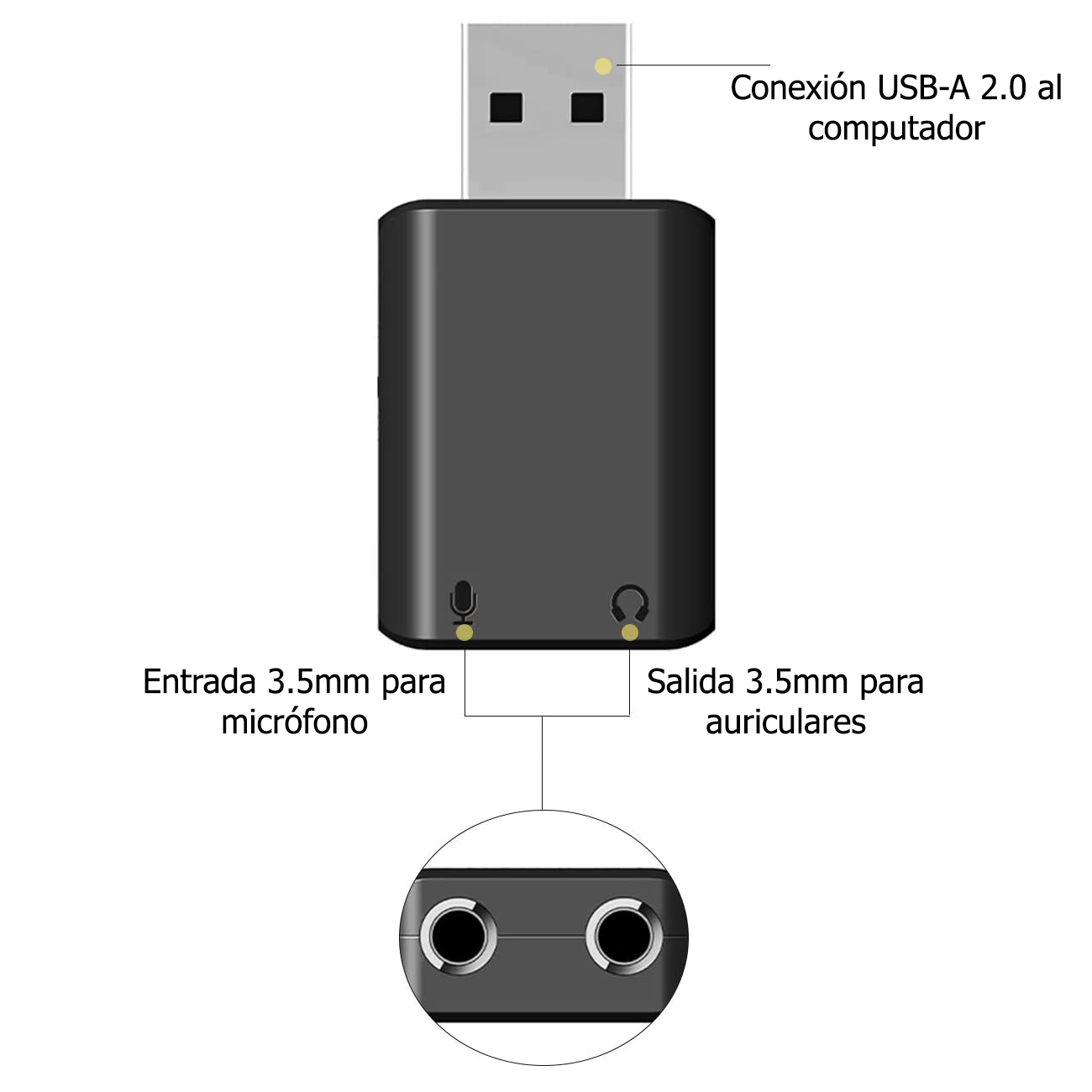 Conecta al computador, al mismo tiempo o independientemente, un micrófono con conector TRS de 3.5mm, y unos auriculares con conector TRS de 3.5mm.