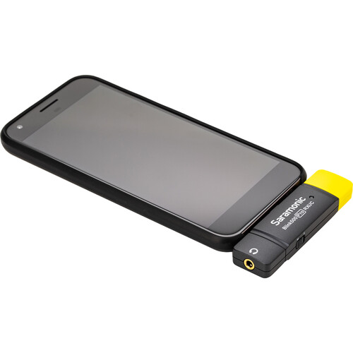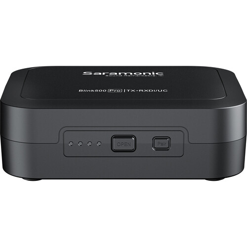 Sistema de micrófonos inalámbricos Saramonic Blink500 Pro B5, especial para puerto USB-C, con baterías de litio incorporadas, receptor USB-C, transmisor, corbatero cableado y receptáculo de carga.