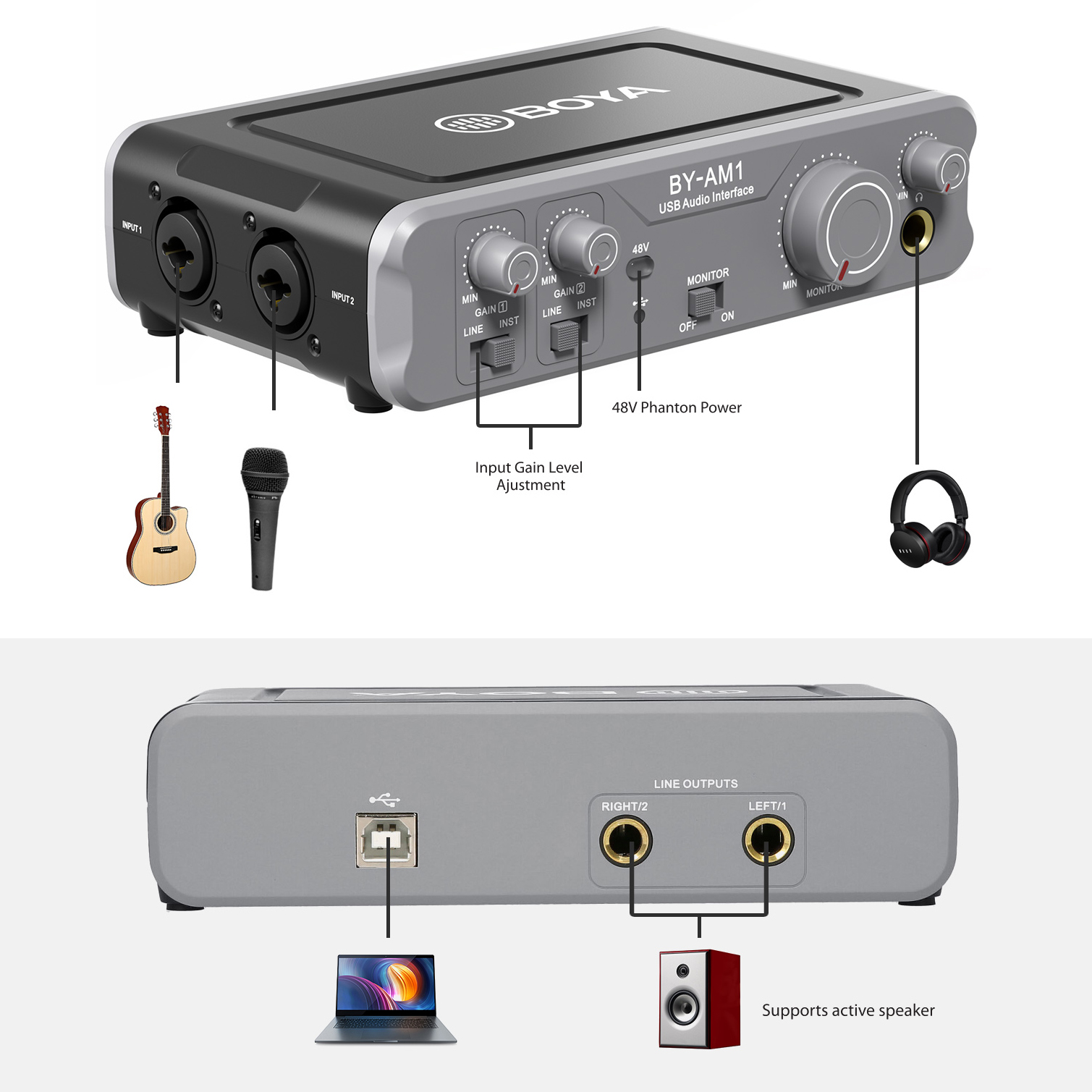 Mezclador de audio de 2 canales USB Boya BY-AM1.