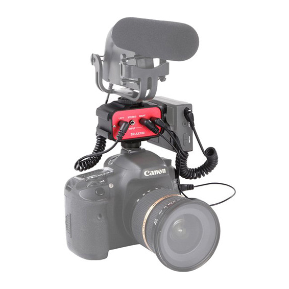 Adaptador mezclador Saramonic SR-AX100 de 2 canales, ideal para grabación de audio profesional en cualquier cámara DSLR, Mirrorless o videocámara que incorpore un puerto de audio de 3.5mm.
