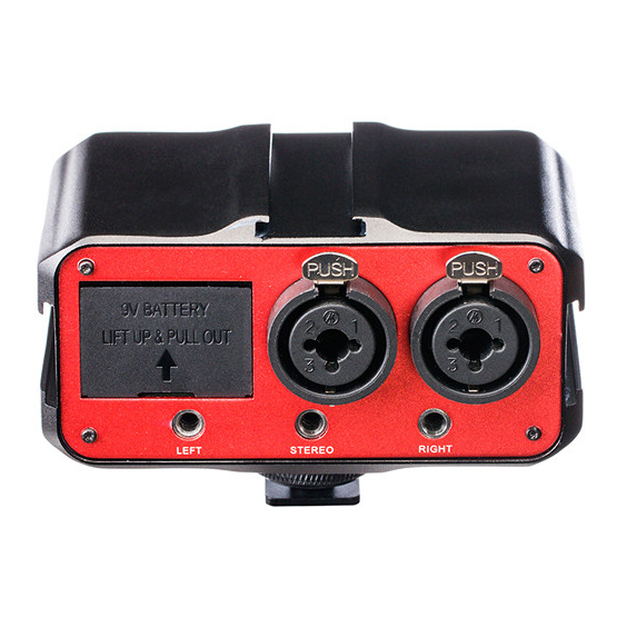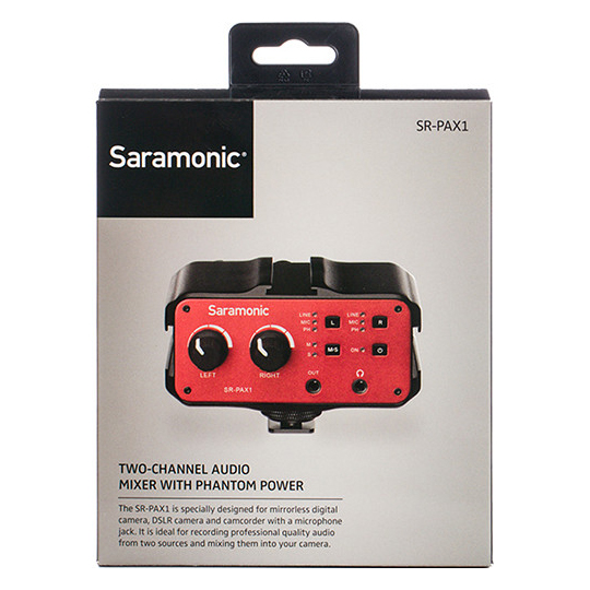 Adaptador mezclador con preamplificador Saramonic SR-PAX1 de 2 canales, con puertos XLR, 6.35mm, 3.5mm, alimentación Phantom, y salida de 3.5mm ideal para grabación de audio profesional en cualquier cámara DSLR, Mirrorless o videocámara que incorpore un puerto de audio de 3.5mm.