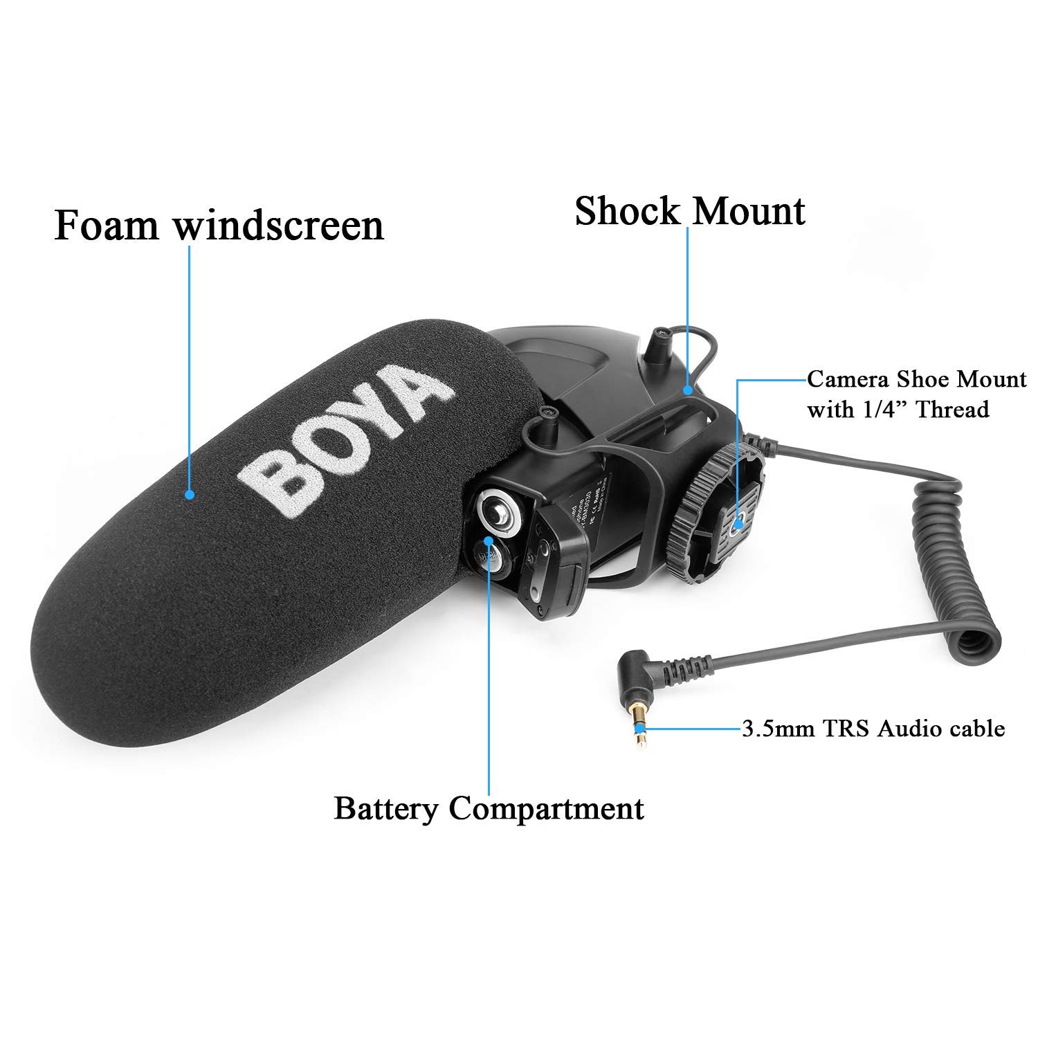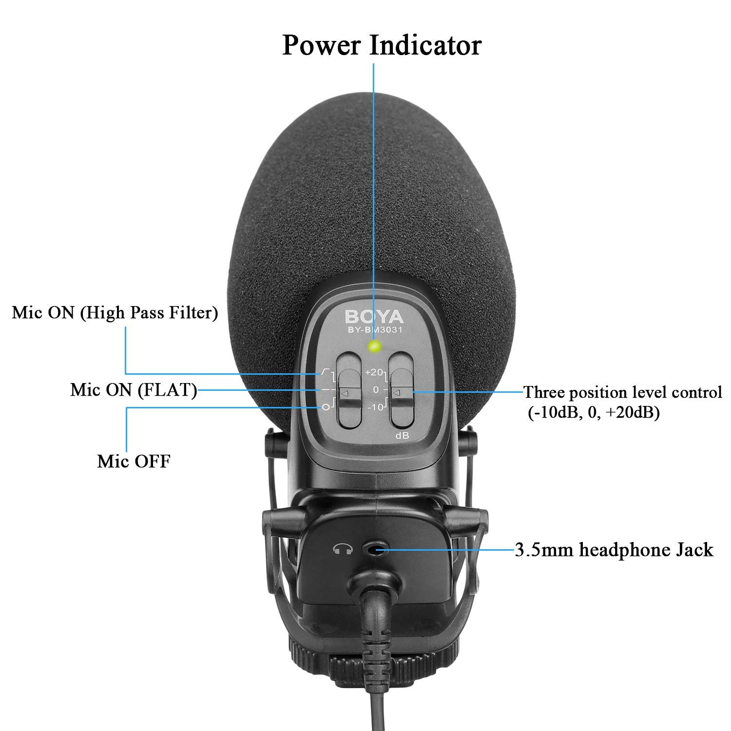 Micrófono unidireccional tipo cañón de vida (shotgun) super cardioide Boya BY-BM3031 con sonido de alta calidad para cámaras DSLR, equipo de video, equipo de grabación de audio y más.