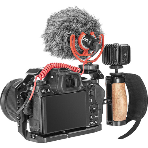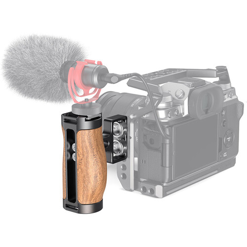 Esta cómoda empuñadura de aluminio y madera se sujeta a su jaula a través de dos tornillos de mariposa de 1/4″-20 espaciados a 0.7″ de distancia, y se desliza para ajustarse verticalmente en la posición correcta. Tiene un soporte de zapata fria en la parte superior para montaje de cualquier accesorio. La ranura integrada le permite agregar una correa de mano o muñeca para mayor seguridad y apoyo. Una llave Allen se guarda dentro del mango para ajustar la posición requerida.