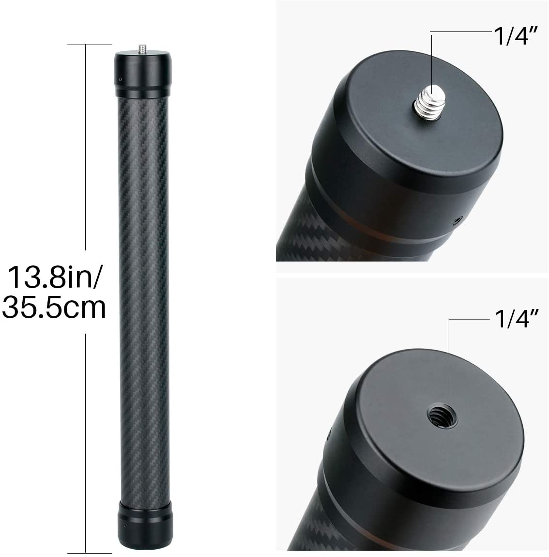 Con 35.5 centímetros de largo, perno de 1/4″ en su parte superior, rosca de 1/4″ en su parte inferior, y un peso de 180 gramos, es ideal como extensión a casi cualquier estabilizador del mercado.