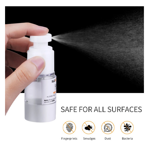 El kit cuenta con un limpiador líquido de 15ml, el cual es una solución de limpieza sin productos químicos que no deteriora el vidrio óptico, es util para limpiar las huellas dactilares, grasa y suciedad, etc.