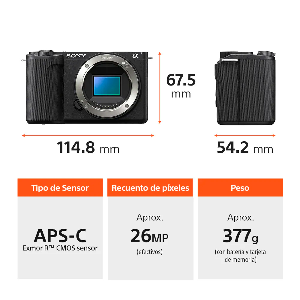 La ZV-E10 II cuenta con la tecnología de sensor más avanzada de Sony gracias a su sensor de imagen CMOS Exmor retroiluminado APS-C. Con una resolución de 26,0 MP, permite capturar imágenes de alta calidad con una alta sensibilidad y menos ruido, incluso en condiciones de poca luz.