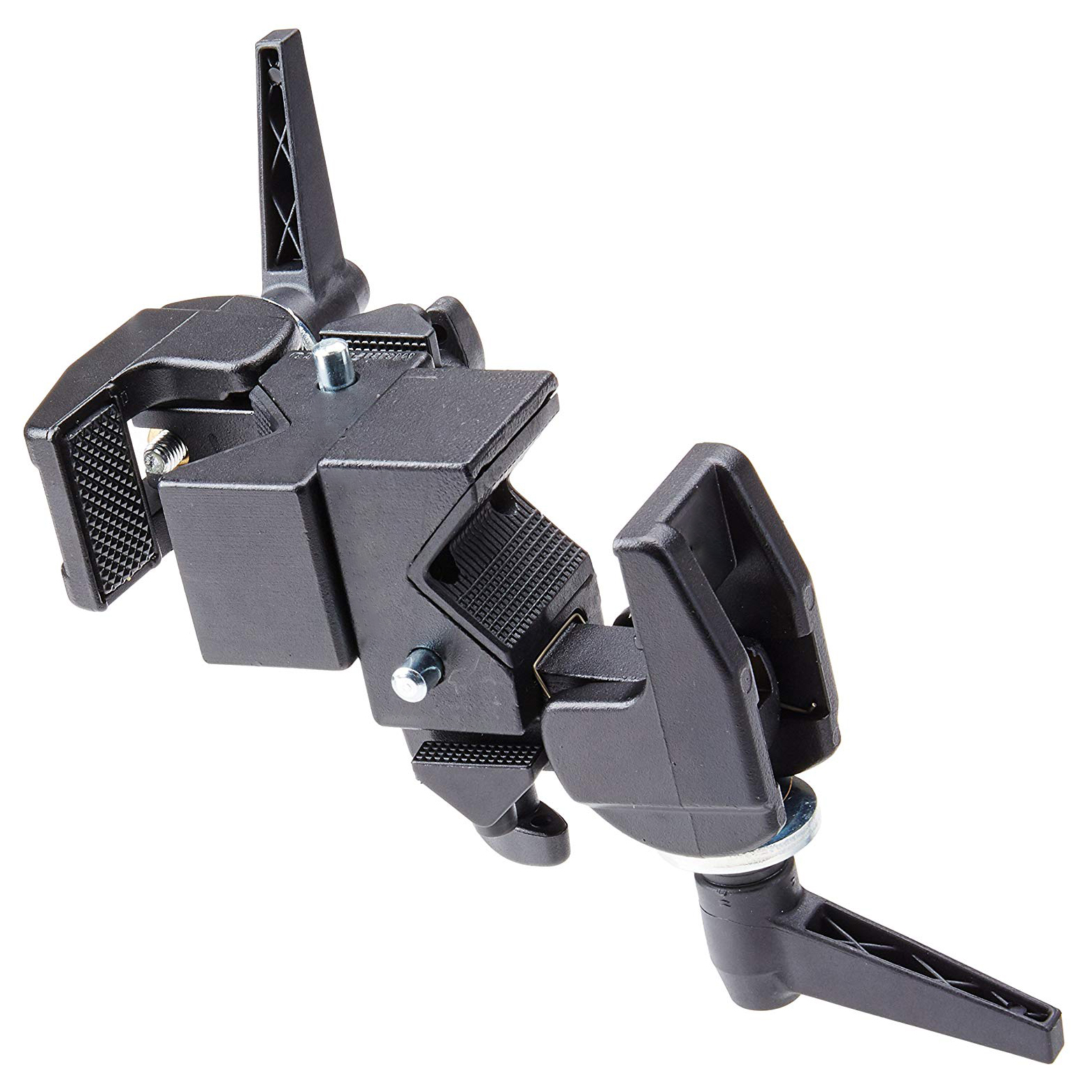 Su construcción en aluminio y acero tiene pernos de 1/4″ -20 por lado, con insertos de caucho para evitar rayar los equipos. Sus 3 articulaciones se ajustan por la misma palanca central.