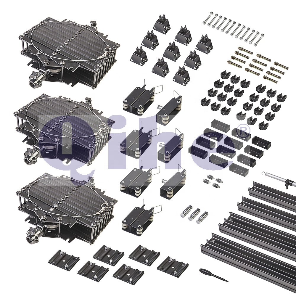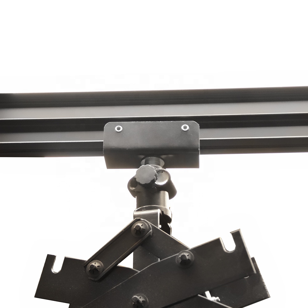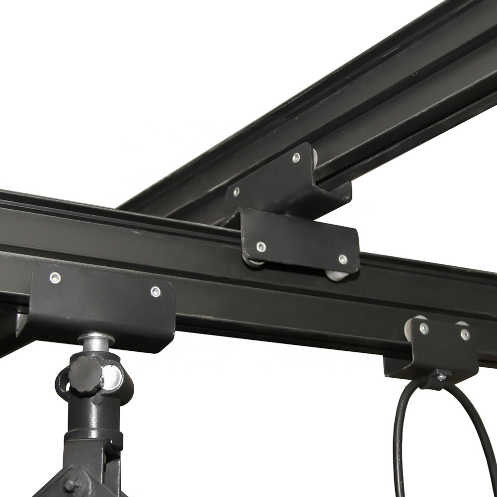 Gracias a sus 3 pantógrafos de 10 kg de capacidad cada uno, con un máximo de extensión de 2 metros hacia abajo por equipo, y un sistema de 2 rieles móviles de 3 metros cada una, el sistema permite configurar el estudio con total flexibilidad, sin utilizar espacio de piso.