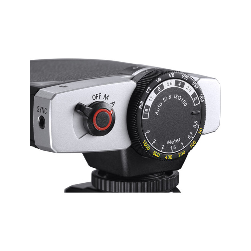 Con un diseño de inspiración vintage y un acabado negro distintivo, la unidad tiene un dial simple que correlaciona ISO con aperturas, niveles de potencia y distancias de disparo. Por ejemplo, si desea disparar a 5′ con un ISO de 400, el dial alinea la potencia f/4 y 1/8.