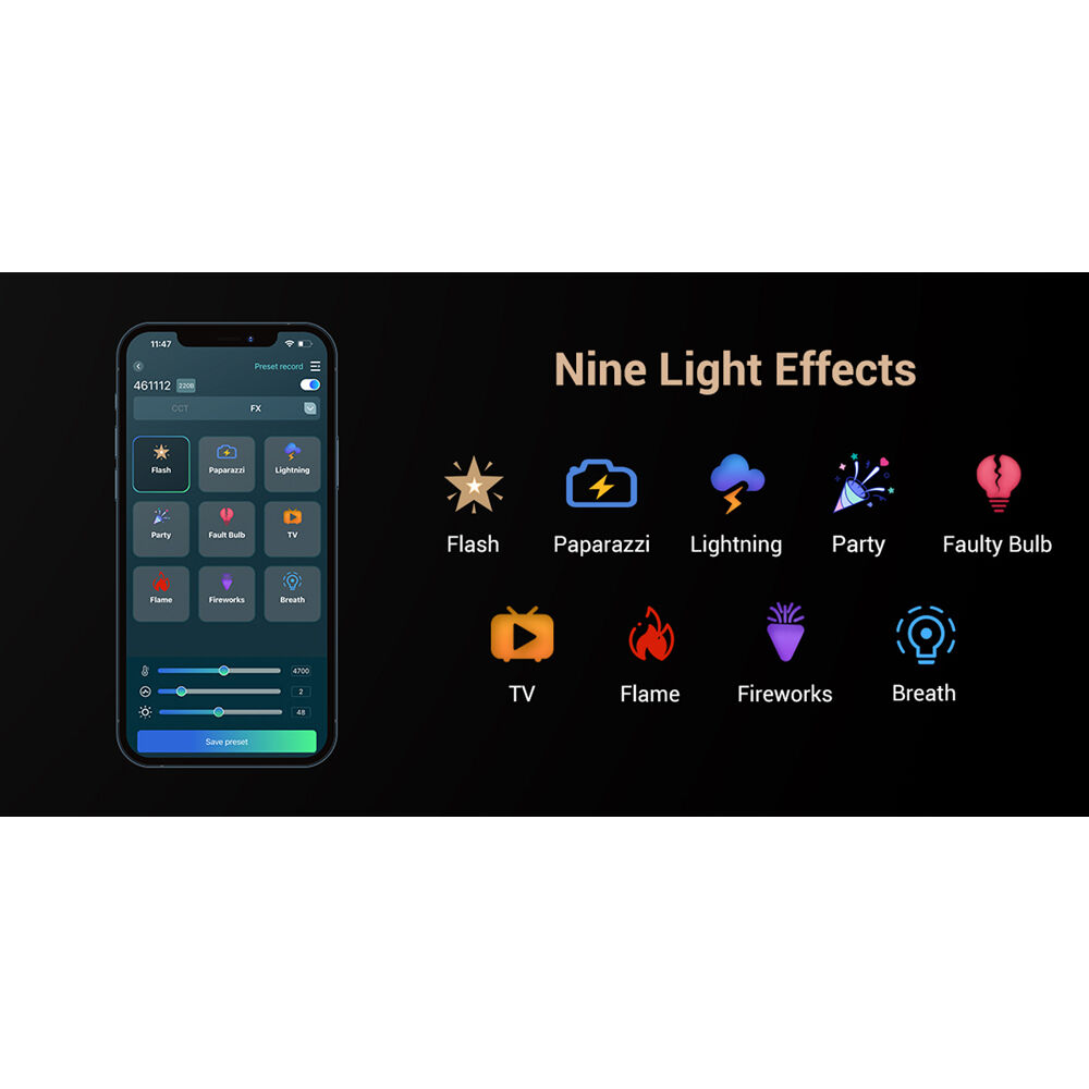 Ofrece 9 efectos especiales, flash, parapazzi, rayos, fiesta, foco roto, TV, fuego, fuegos artificiales, respiración.