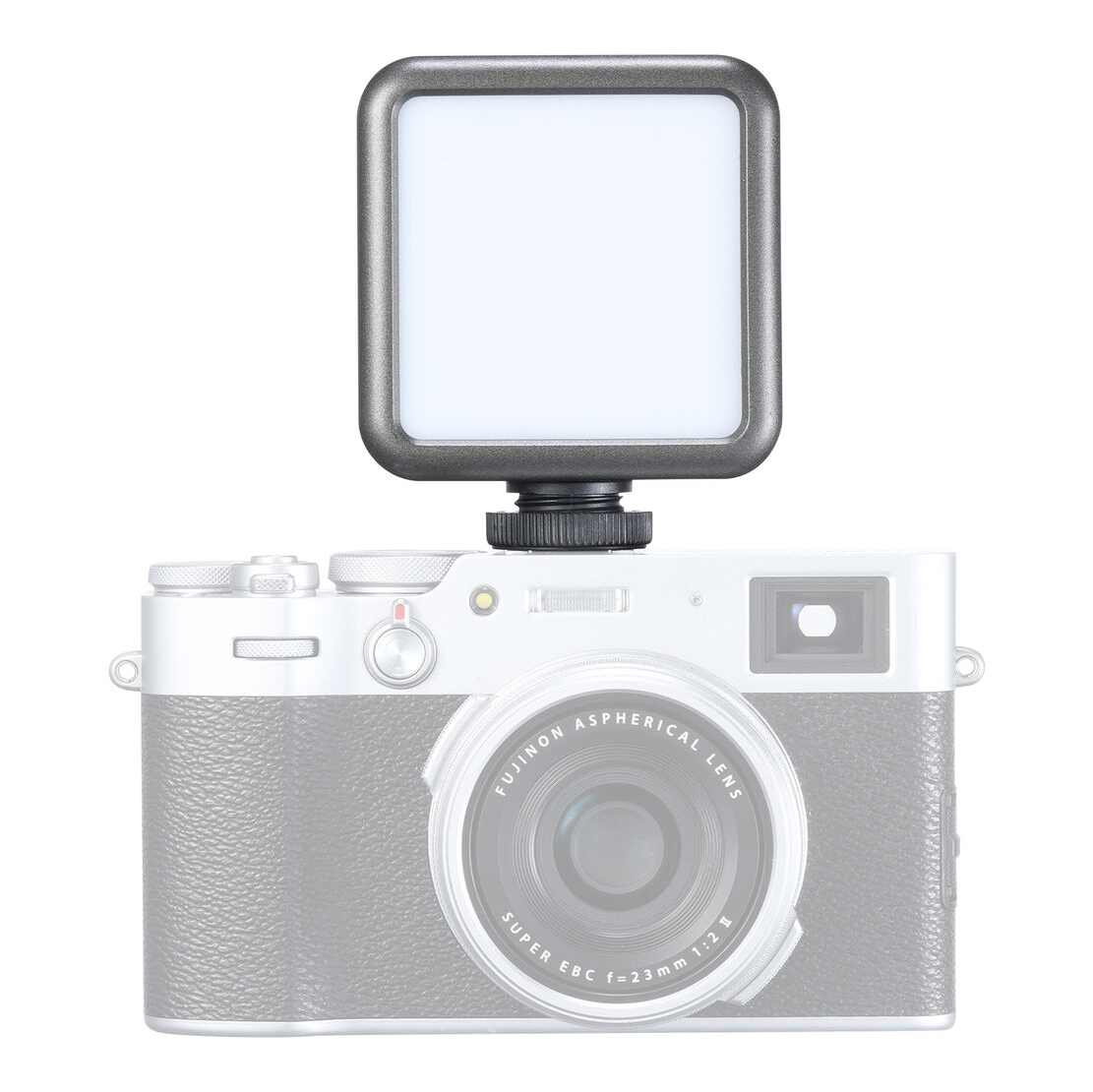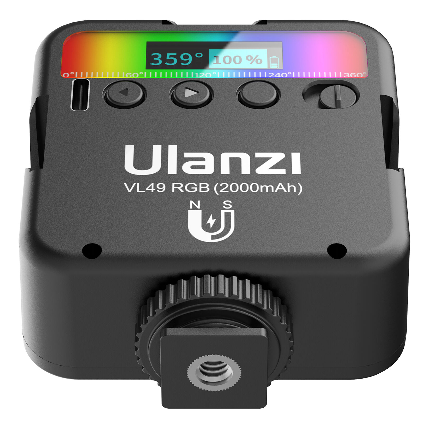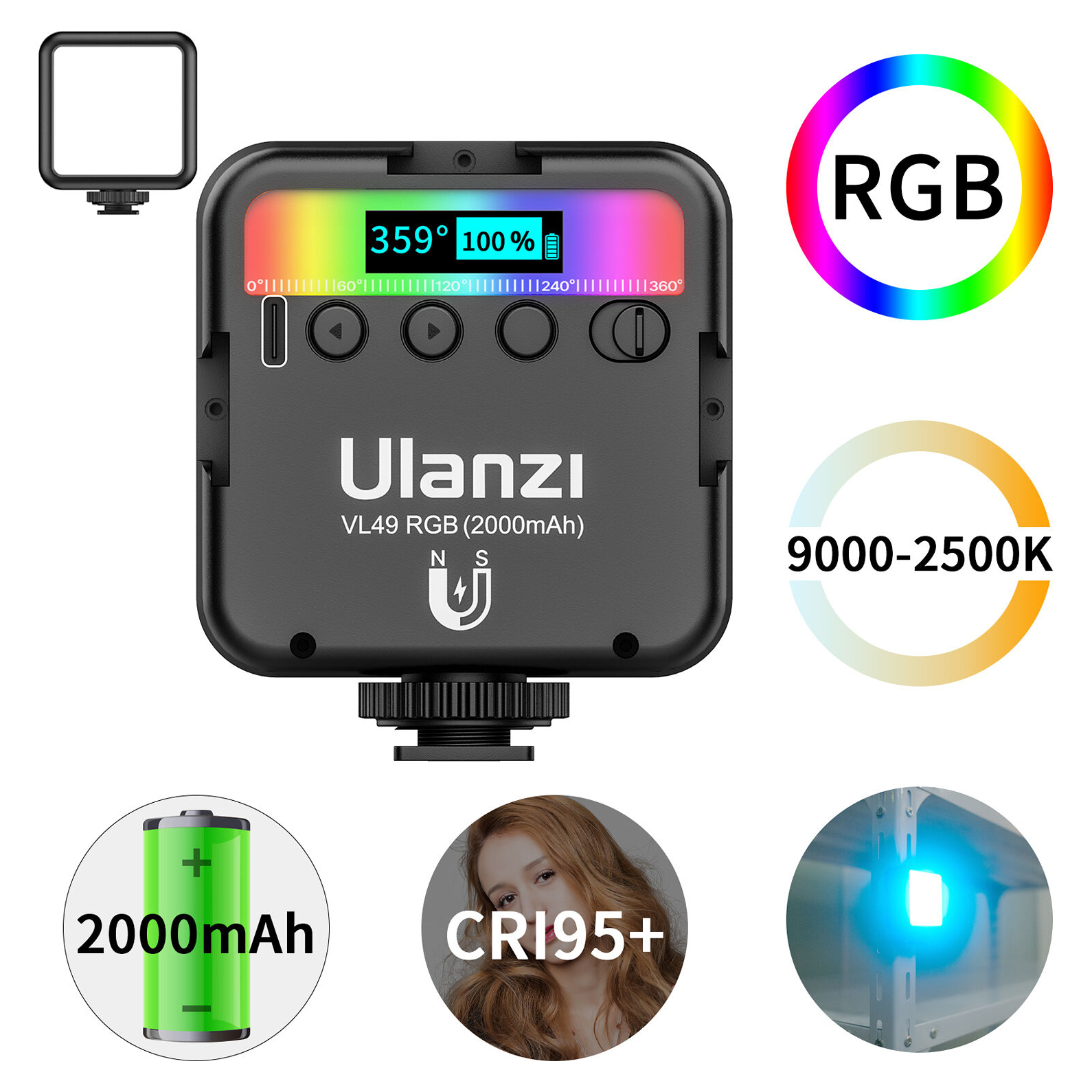 Luz LED RGB recargable compacta ULANZI VL-49 RGB, con batería de litio de 2,000 mAh, luz blanca regulable en temperatura, gama RGB completa, y 6 watts de potencia.