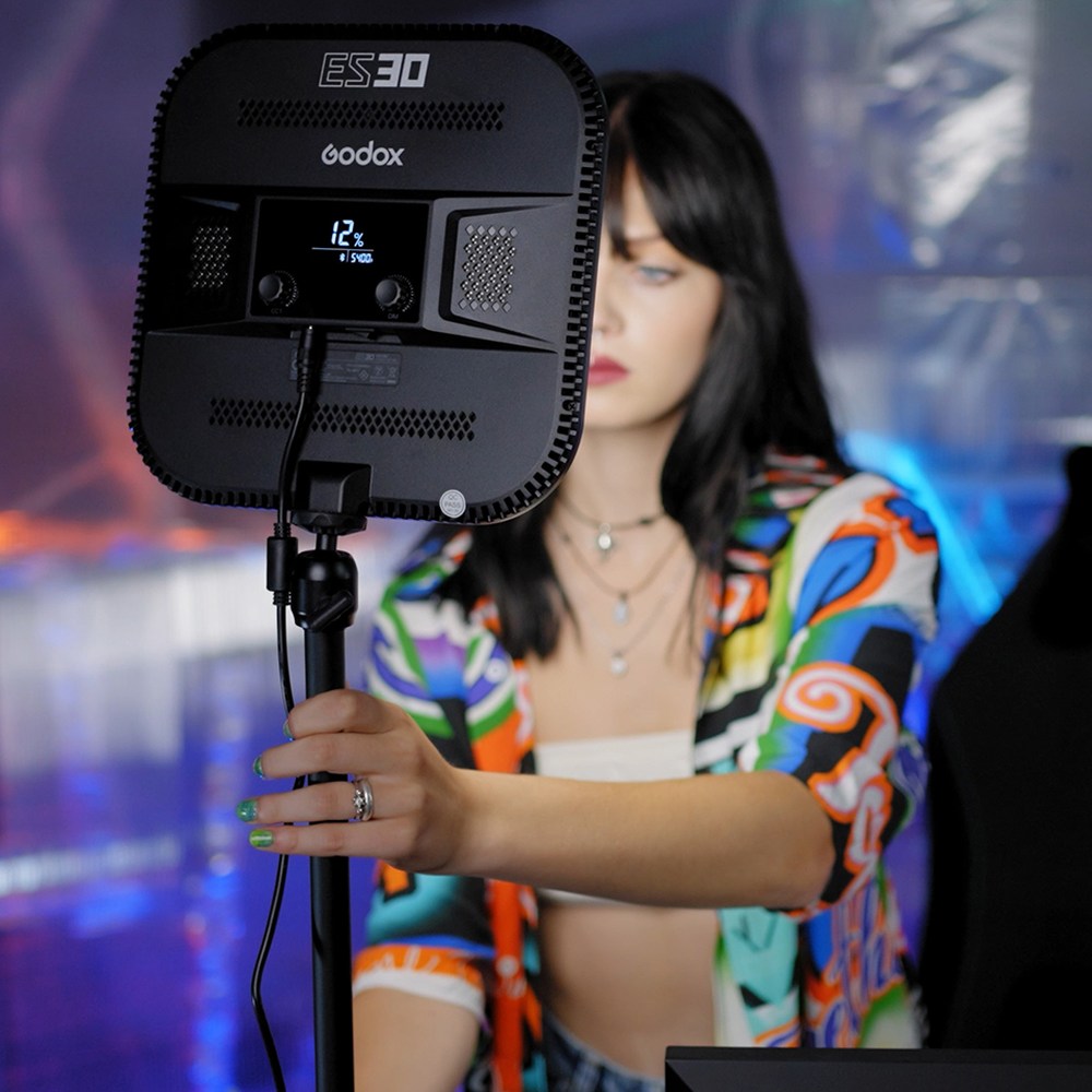 El ES30 tiene una temperatura de color variable de 2800 a 6500 K con índices CRI/TLCI de 96/97 para garantizar la precisión en la reproducción de los colores. La luz es regulable y puede realizar ajustes en el color y el brillo de la luz, o de forma inalámbrica desde su teléfono inteligente con una aplicación gratuita. El ES30 está listo para su uso en todo el mundo gracias a su adaptador de corriente de 100 a 240 VCA.