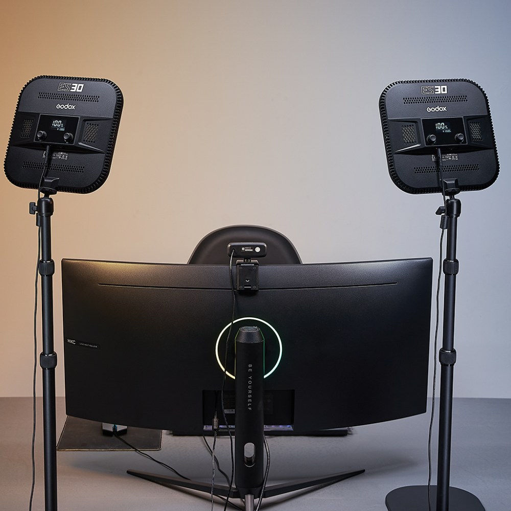 LED E-Sport ES30 con soporte de escritorio de Godox es una excelente opción cuando se desea viajar liviano y aún así tener un rendimiento superior. El kit incluye la luz LED ES30, un adaptador de corriente, un cable y un soporte de escritorio.