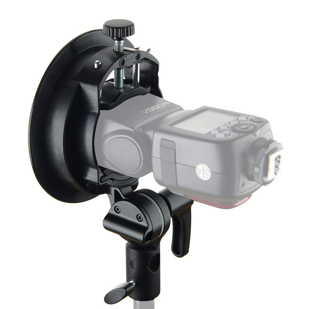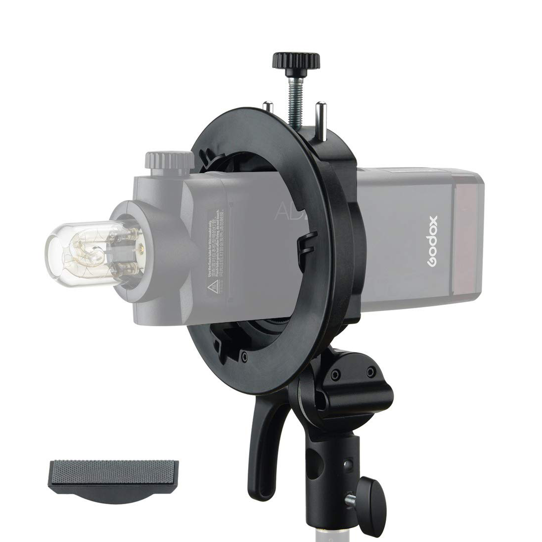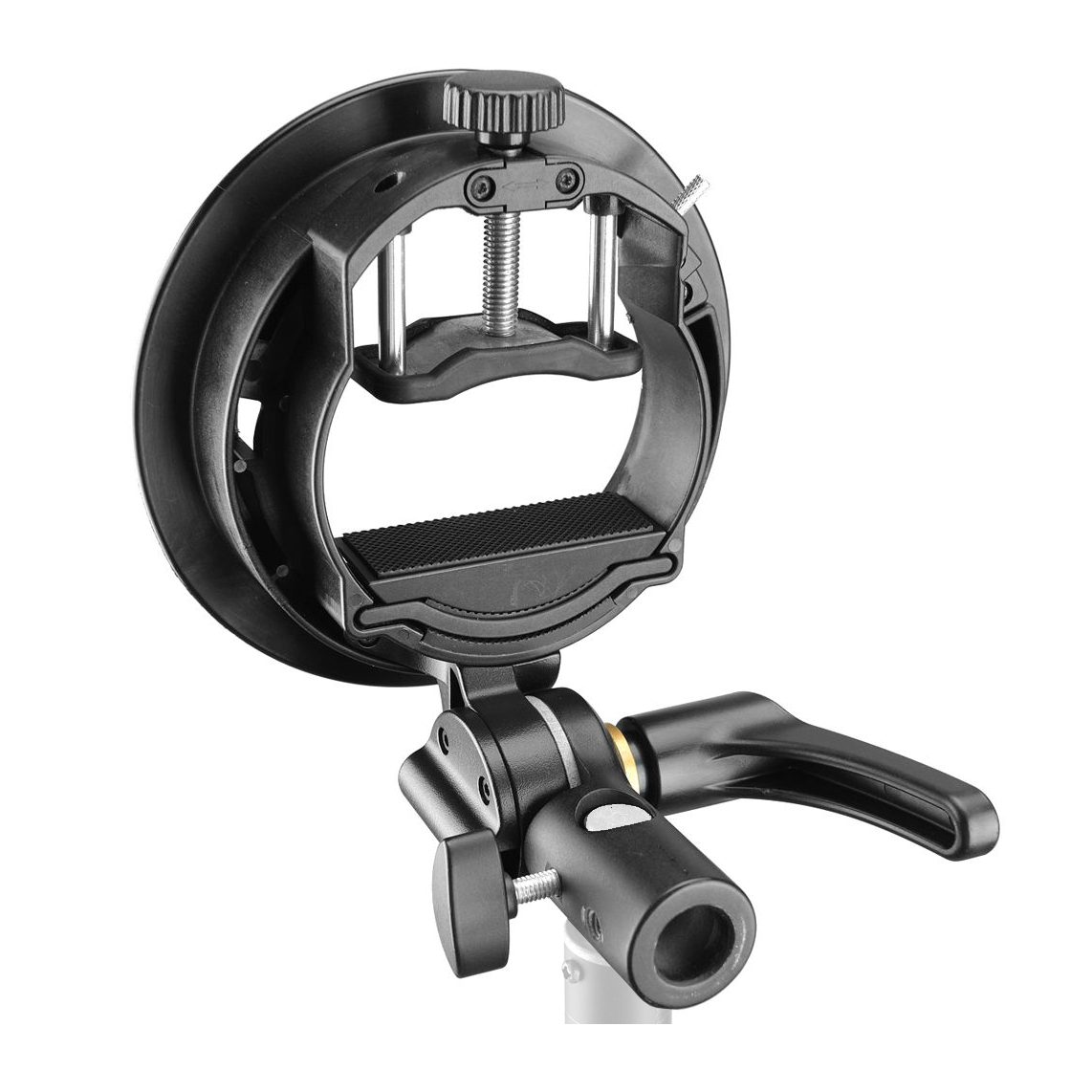 Bracket Godox S2, para flashes de cámara speedlights. Rediseñado para flashes de cabeza redonda, y gracias a sus adaptadores incluidos, casi para cualquier speedlight.