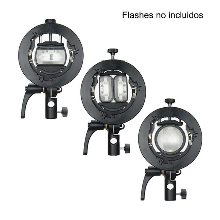 - Acepta flashes de cámara de cualquier marca, de cabeza rectangular o redonda.