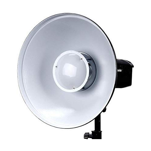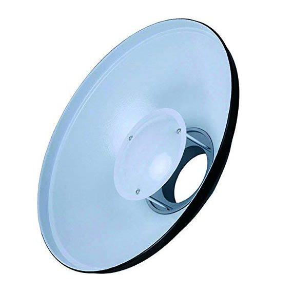 Beauty Dish Godox BDR-W420, de 420mm de diámetro, metálico, con interior blanco, acople tipo Bowens, y tela difusora blanca.