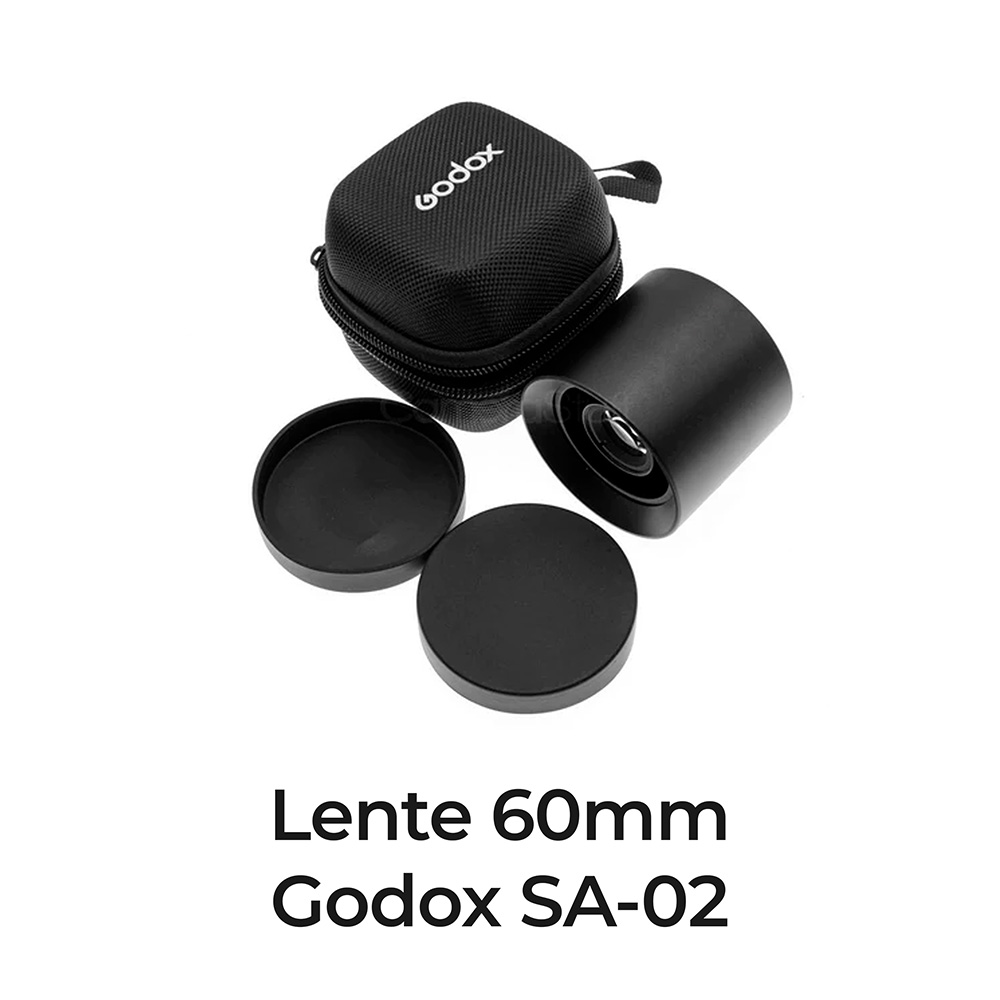 La lente Godox SA-02 60 mm es una lente intercambiable (una de tres: 60 mm, 85 mm, 150 mm) que, junto con la superposición de proyección Godox SA-P1, ha sido diseñada para iluminación selectiva del objeto.