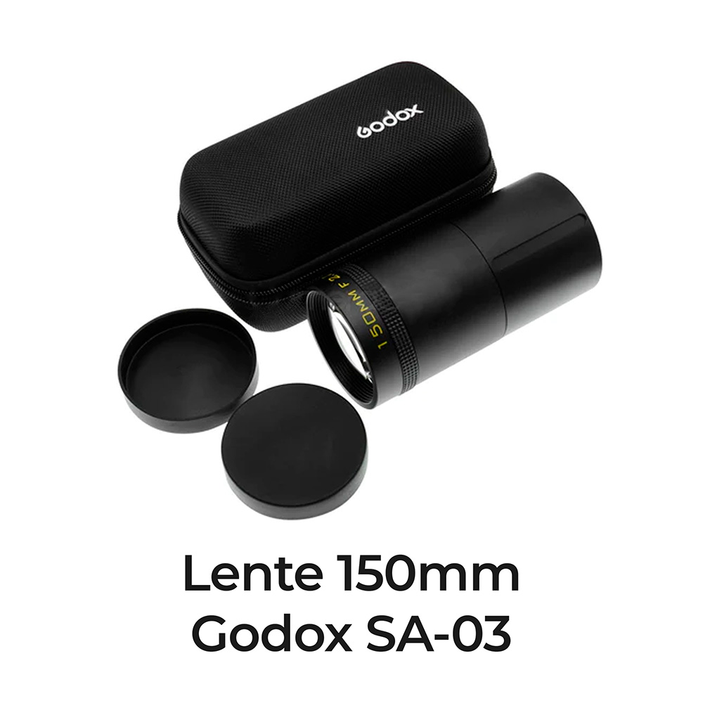 La lente Godox SA-03 de 150 mm es una lente intercambiable (una de tres: 60 mm, 85 mm, 150 mm), que junto con la superposición de proyección Godox SA-P1 fue diseñada para una iluminación precisa y selectiva del objeto.