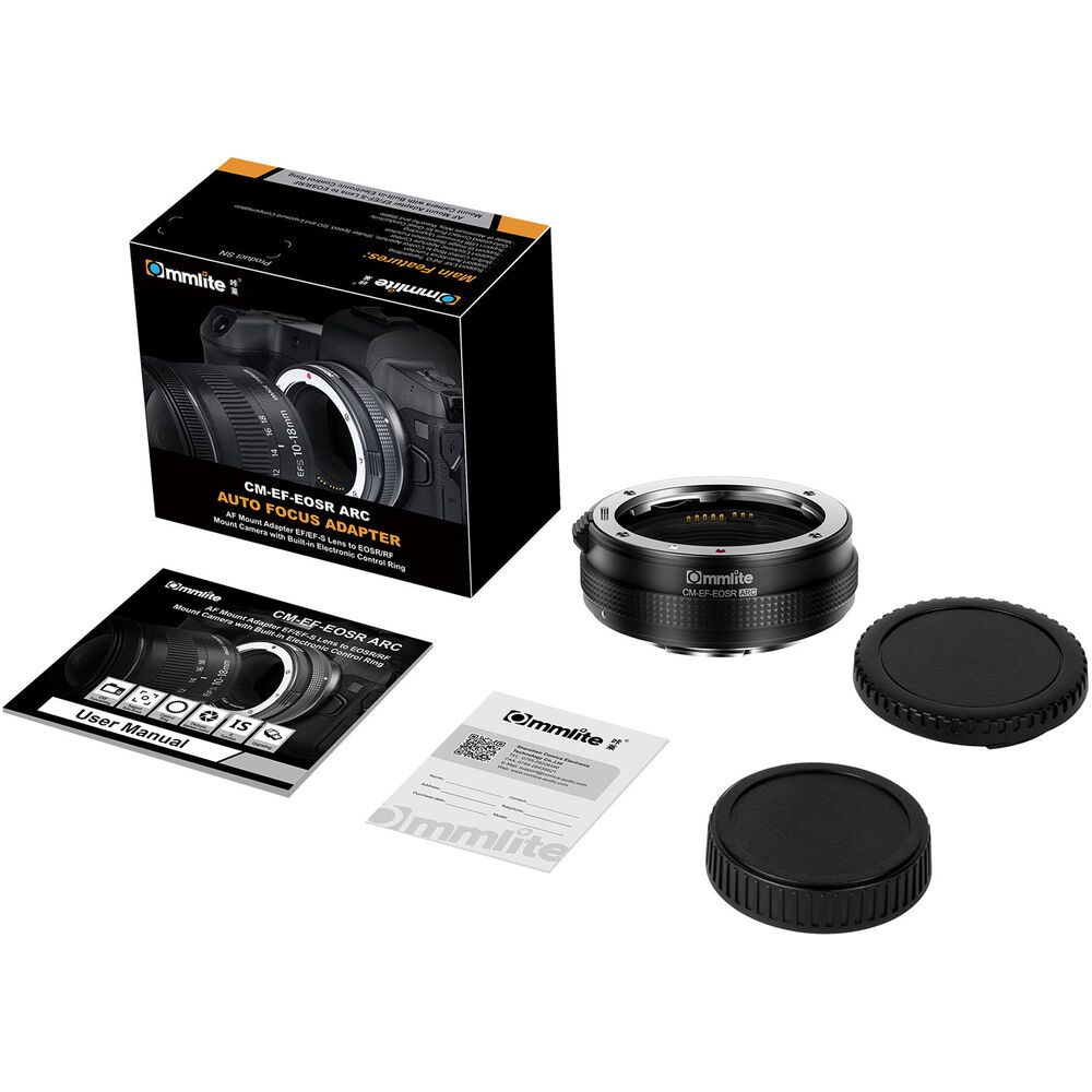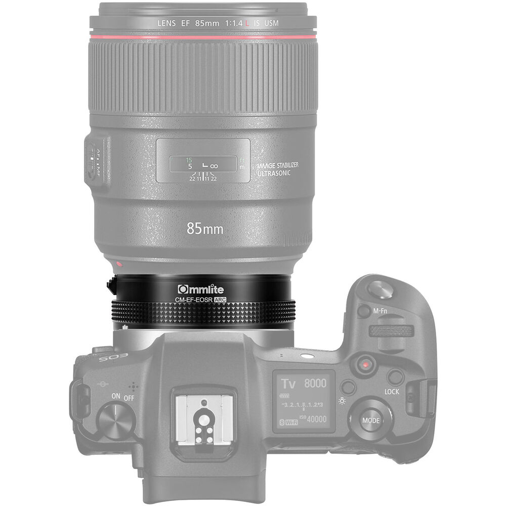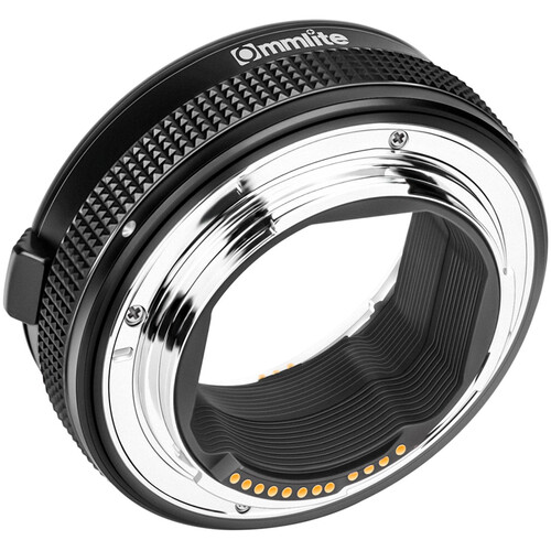 Adaptador automático Commlite CM-EF-EOS-R ARC para utilizar lentes con montura Canon EF/EF-S en cámaras Canon con montura RF. El adaptador posee anillo de control programable para control de apertura, velocidad, ISO y control de exposición, configurables desde la cámara.