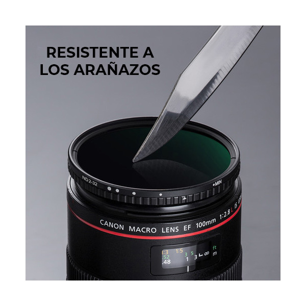 Un filtro polarizador organiza y filtra la luz polarizada direccionalmente, lo que permite la absorción de gran parte de esta luz. Esto da como resultado una reducción notable del resplandor y los reflejos de las superficies no metálicas y un aumento en la saturación de los cielos y el follaje. El componente de filtro de densidad neutra variable proporciona una reducción de luz ajustable de 1 a 5 paradas. Oscurece toda la imagen de manera uniforme, lo que permite hacer una fotografía con una apertura más amplia o una velocidad de obturación más lenta de lo que normalmente se requiere.