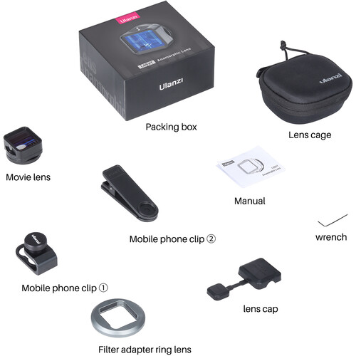 Lente anamórfico para celulares Ulanzi 1.55XT, ideal para cine, creando una relación de aspecto de 2.8:1. Incluye acople para filtros estándares de 52mm.