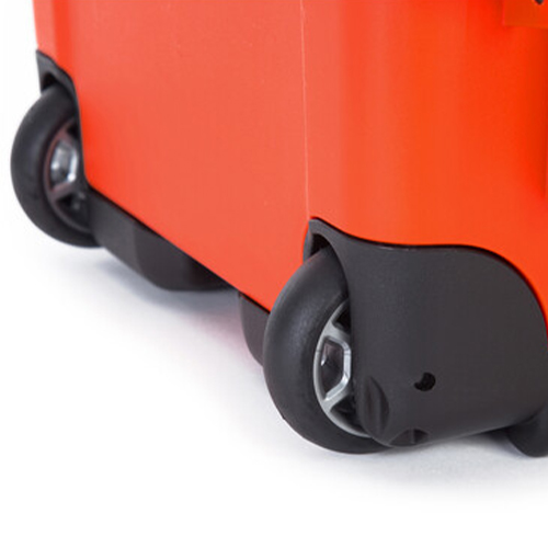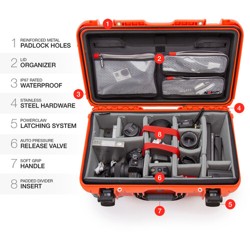 Maleta rígida naranja con ruedas y agarradera extensible Nanuk 935 con divisores acolchados y organizador superior, de 28.5 litros de capacidad. Medias perfectas como Carry-On en la mayoría de las aerolíneas.