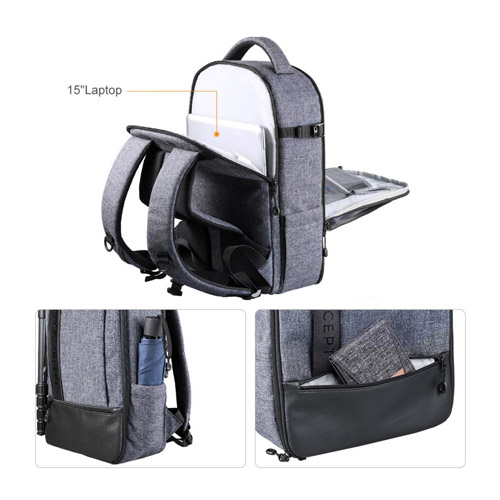 Esta mochila para cámara de fotografía DSLR sostiene y protege 1-2 cámaras DSLR/SLR, 4-5 lentes, flash speedlite, computadora portátil de hasta 15 pulgadas, trípode o monopié liviano y otros elementos esenciales para la fotografía
