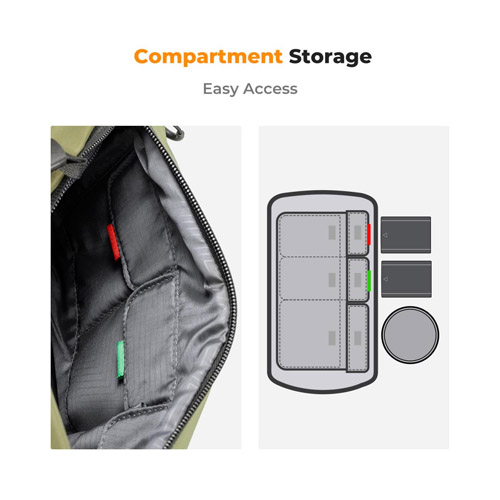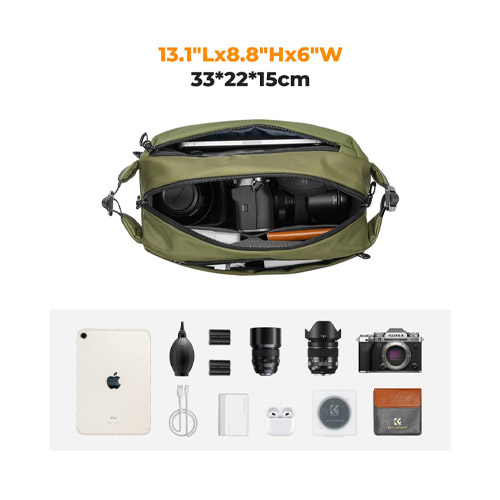 La bolsa bandolera para cámara Alpha de 10 litros de color verde oscuro de K&F Concept tiene espacio para una cámara y dos lentes. Este bolso se puede llevar al hombro, alrededor de la cintura o cruzado. Confeccionado con un tejido impermeable, resistente a los arañazos y al desgaste, tu equipo estará protegido de golpes y humedad. Cuenta con algodón EPE de alta densidad a prueba de golpes de 10 mm para mayor protección. El interior tiene compartimentos flexibles para organizar su equipo y accesorios. La partición se puede quitar si desea más espacio interior. Los anillos para tirar de la cremallera se pueden entrelazar para garantizar que sus artículos permanezcan seguros.