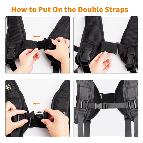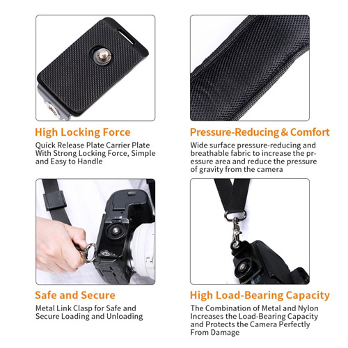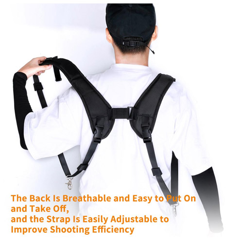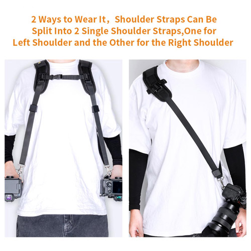 La correa de la cámara de 70 cm ajustable-profesional se puede ajustar según sea necesario. La gran y cómoda almohadilla de algodón se colocará perfectamente sin resbalar. Se pueden llevar dos cámaras al mismo tiempo.
