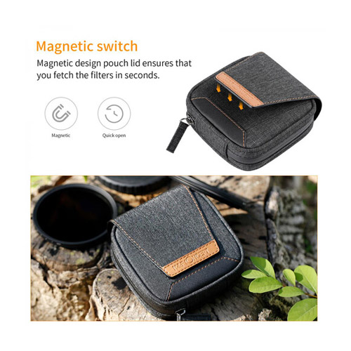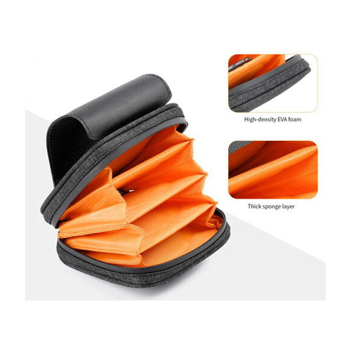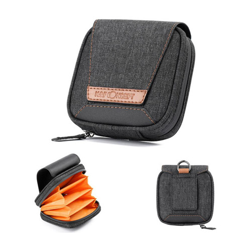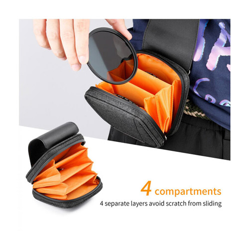 La caja de filtro circular K&F Concept cuenta con cuatro bolsillos individuales que admiten filtros redondos de hasta 95 mm. Mide un tamaño compacto de 4,8 x 4,6″ cuando está cerrado, está hecho con tela impermeable y cuenta con una cremallera impermeable. Los cuatro bolsillos están diseñados con EVA y algodón perlado de alta densidad para brindar protección acolchada y absorción de impactos para sus filtros. El estuche también Ofrece un cierre y una hebilla en forma de D en la parte trasera.