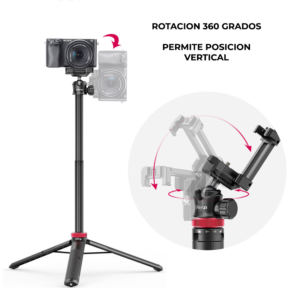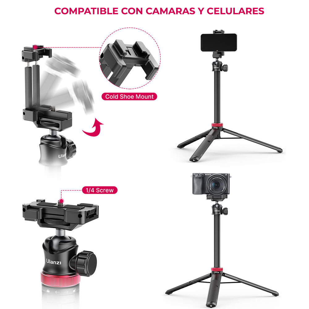 Mini trípode extensible Ulanzi MT-44 para cámaras DSLR, celulares, GoPro, con capacidad de 1.0 kg de carga, y zapata fría lateral para otros accesorios.
