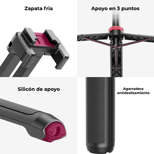 El trípode puede cerrarse para utilizarse como agarradera, y su brazo extensible puede llevarlo desde los 32 cm en posición cerrada, a 146.5 cm en posición extendida.