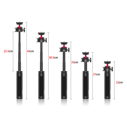 El trípode puede cerrarse para utilizarse como agarradera, y su brazo extensible puede llevarlo desde los 22 cm en posición cerrada, a 44 cm en posición extendida.