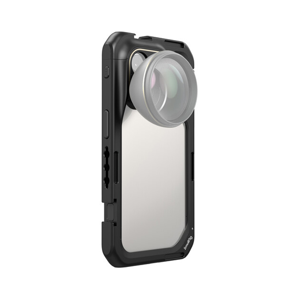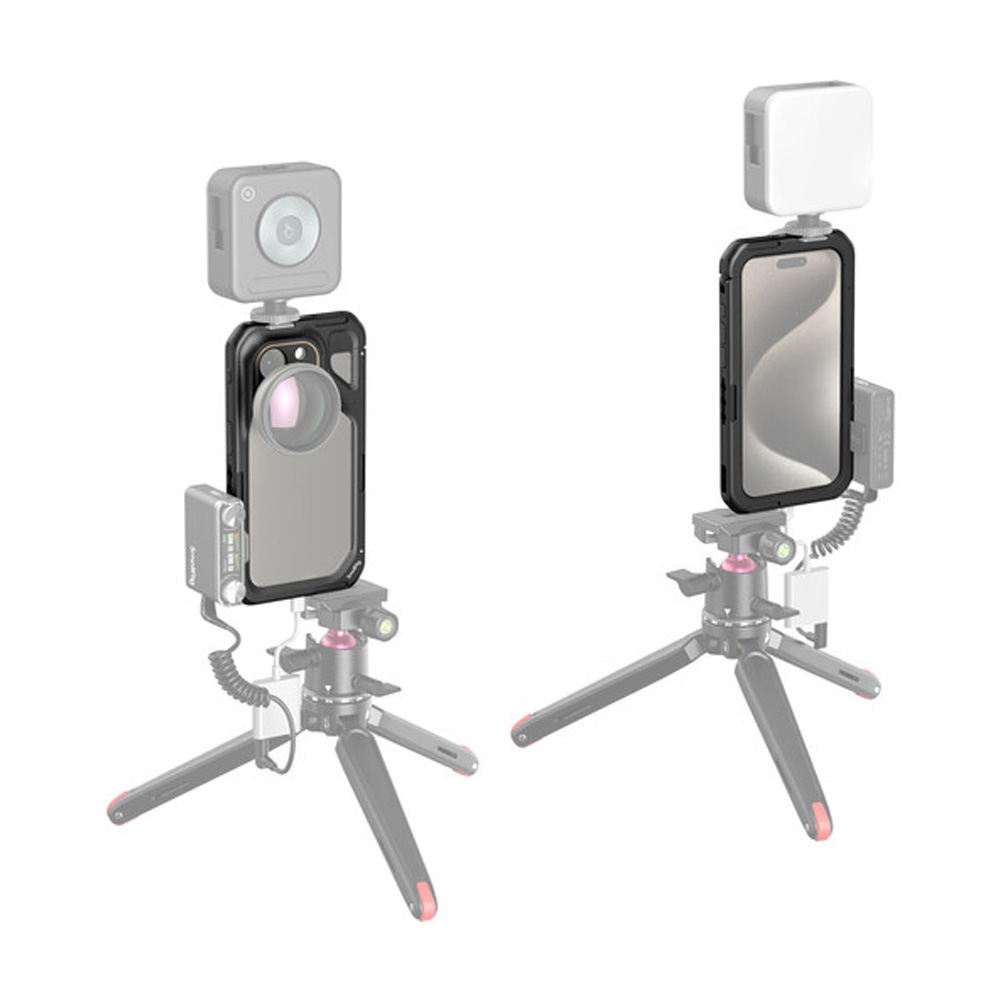 Diseñado para el iTeléfono 15 Pro, Mobile Video Cage de SmallRig es ideal para videografía profesional, transmisión en vivo, vlogging y más. Múltiples orificios roscados de 1/4″-20 y monturas de zapata fría admiten accesorios, incluido un mango lateral, trípode, micrófono, luz LED, correa de mano y más. Su placa posterior de lente es compatible con lentes con montura M, pero se puede cambiar. para uno que admita lentes Moment de la serie T, así como lentes roscados de 17 y 37 mm. El diseño ahuecado de la jaula permite acceso completo al puerto y los botones de su teléfono. Los usuarios también podrán aprovechar el radar, el ultra gran angular lentes angulares y carga inalámbrica MagSafe. Esta jaula cuenta con un diseño de bloqueo rápido que hace que sea más fácil de montar y desmontar y al mismo tiempo lo hace más seguro y estable. Gracias a la construcción de metal y las almohadillas integradas, su teléfono estará protegido contra vibraciones y rayones, sin importar si disparas horizontal o verticalmente.