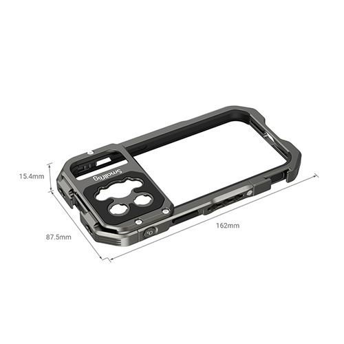 Jaula de aluminio diseñada para el Iphone 13 Pro, da seguridad mientras posibilita el acceso a la funcionalidad completa del celular. Ofrece adicionalmente la posibilidad de montar accesorios en su dispositivo.