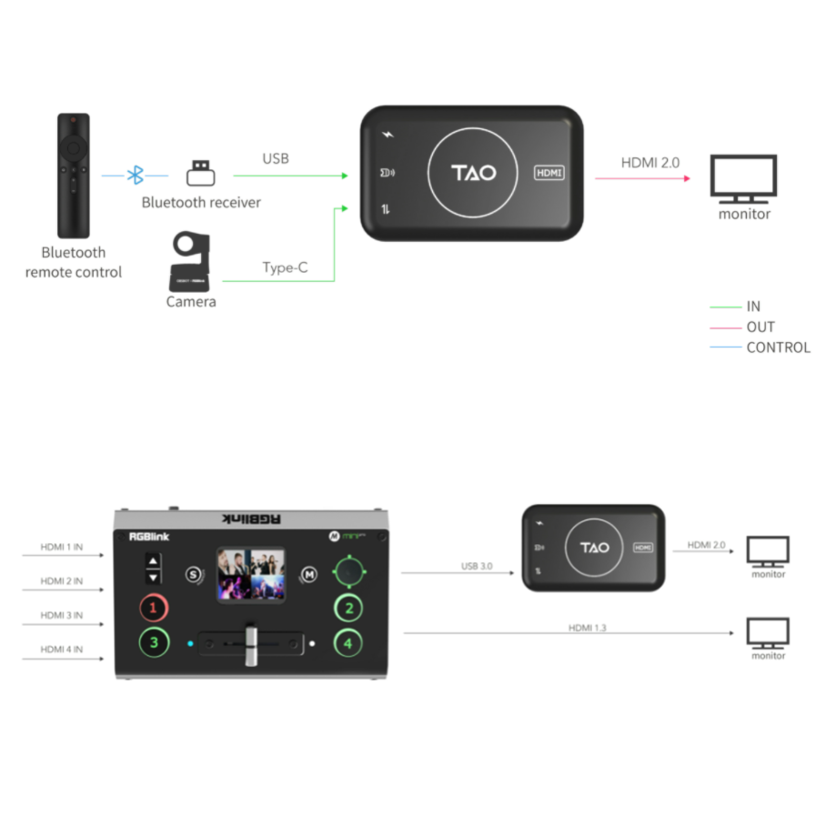 Si su cámara web o dispositivo USB de entrada tiene capacidad de control remoto por Bluetooth, el receptor puede ser conectado al puerto USB-A del TAO 1tiny.