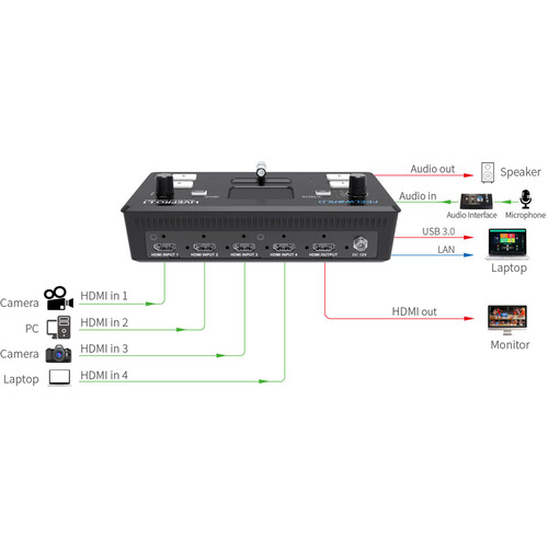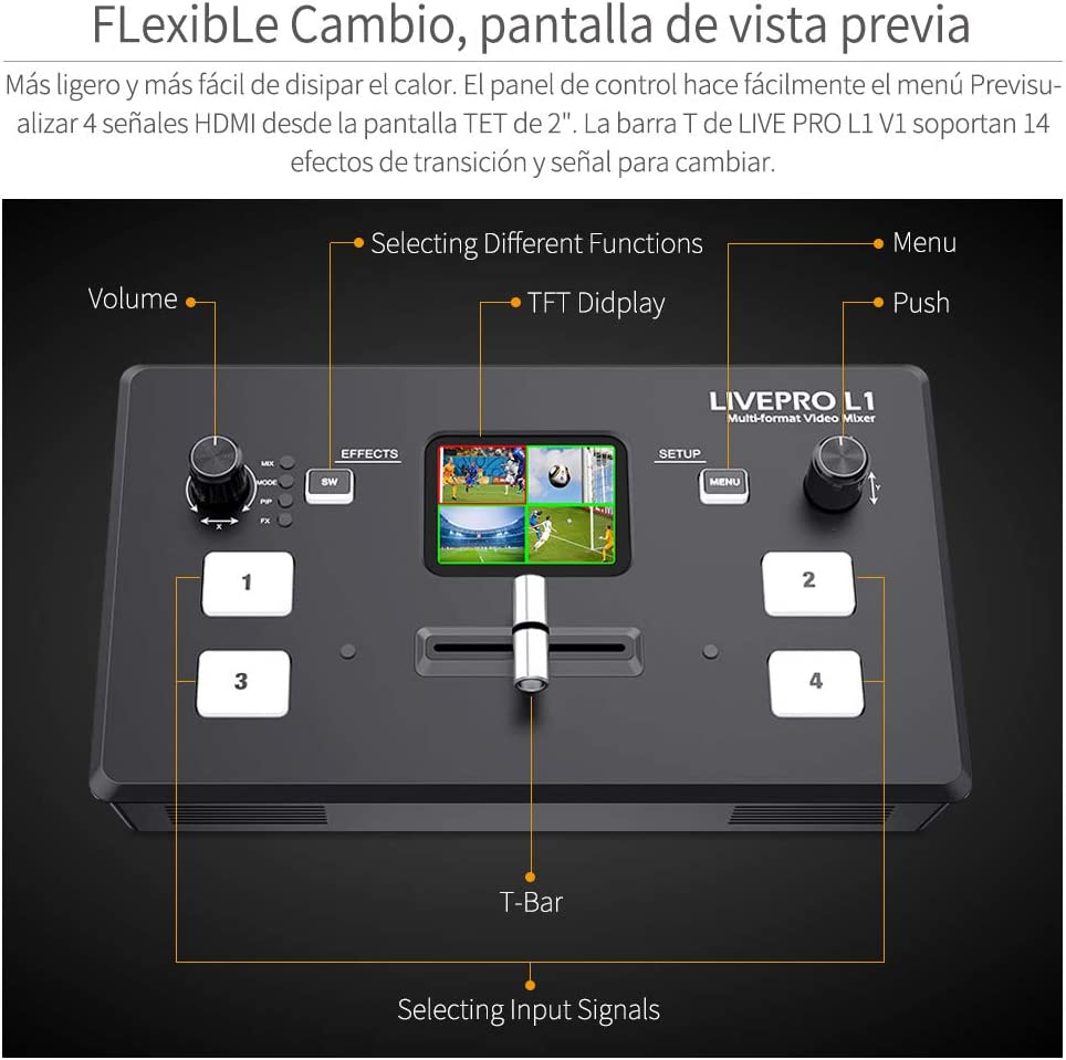 LIVEPRO L1 V1 con 4 entradas CH HDMI y 1 salida HDMI, todas soportan 1080p. Para la transmisión en vivo, hay una interfaz USB3.0. Y además, el puerto LAN para controlar y actualizar; para audio, tiene 2 interfaces, una para entrada y otra para salida. Todo esto facilita la creación de producciones profesionales con varias cámaras. Puede transmitir cualquiera desde las 4 entradas HDMI a cualquier plataforma de transmisión en vivo a través de un software de transmisión en vivo de terceros como OBS. Simplemente conecte LIVEPRO L1 y podrá cambiar en vivo entre 4 entradas de cámara de video de alta calidad para obtener imágenes de mejor calidad. Conecte una computadora para diapositivas de PowerPoint o consolas de juegos.